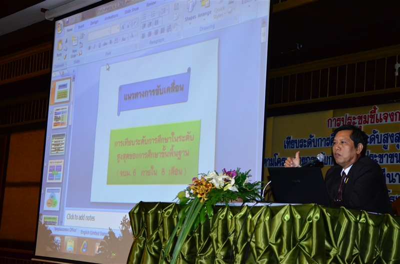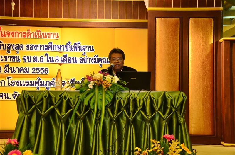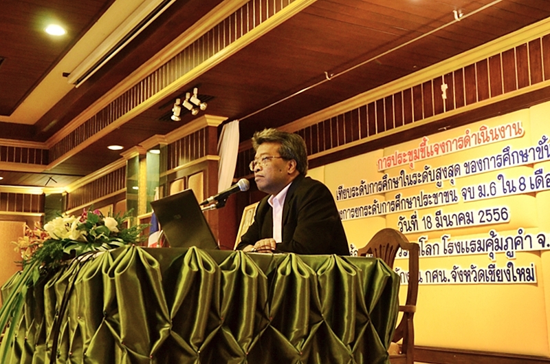: การประชุมชี้แจงผู้บริหาร และเจ้าหน้าที่รับผิดชอบงานเทียบระดับการศึกษาในระดับสูงสุดของการศึกษาขั้นพื้นฐาน ตามโครงการยกระดับการศึกษาประชาชน จบ ม.6 ใน 8 เดือน อย่างมีคุณภาพ เมื่อวันที่ 18 มีนาคม 2556 ณ โรงแรมคุ้มภูคำ จังหวัดเชียงใหม่ เพื่อชี้แจง ผู้บริหาร กศน.อำเภอทุกแห่ง เจ้าหน้าที่ผู้รับผิดชอบงานเทียบระดับ, ครูอาสา 75 คน, หัวหน้า กศน.ตำบล 204 คน และเจ้าหน้าที่จากสำนักงาน กศน.จังหวัดเชียงใหม่ เกี่ยวกับนโยบายหลักการและแนวคิด KSM Model โดยนายศุภกร ศรีศักดา ผู้อำนวยการสำนักงาน กศน.จังหวัดเชียงใหม่ , ขั้นตอนการประเมินและแผนการเรียนรู้ จบ ม. 6 ใน 8 เดือน โดยนายวรวัฒน์ สินธิพานนท์ ผอ.กศน.อำเภอแม่ริม , แนวทางการขับเคลื่อนการดำเนินงานสู่เป้าหมาย นายนิติธร เทพเทวิน ผอ.กศน.อำเภอเมือง และบทบาทหน้าที่ของหน่วยงาน-ครูที่ปรึกษา โดยนางพรรณี ใหม่ประสิทธิกุล รองผู้อำนวยการ สำนักงานกศน.จังหวัดเชียงใหม่ รวมผู้เข้าร่วมประชุม 350 คน.